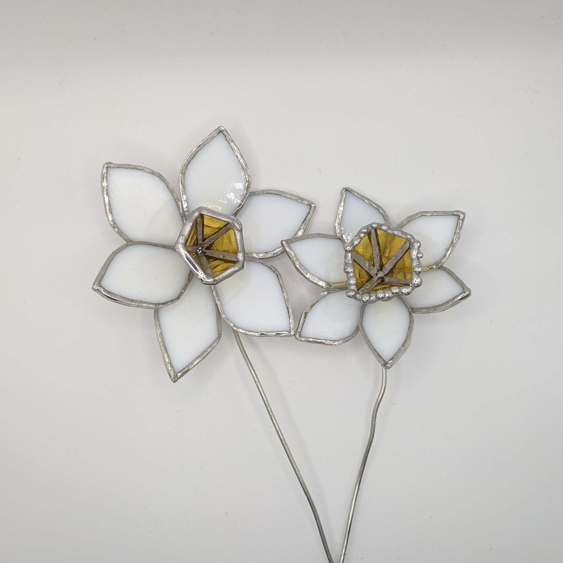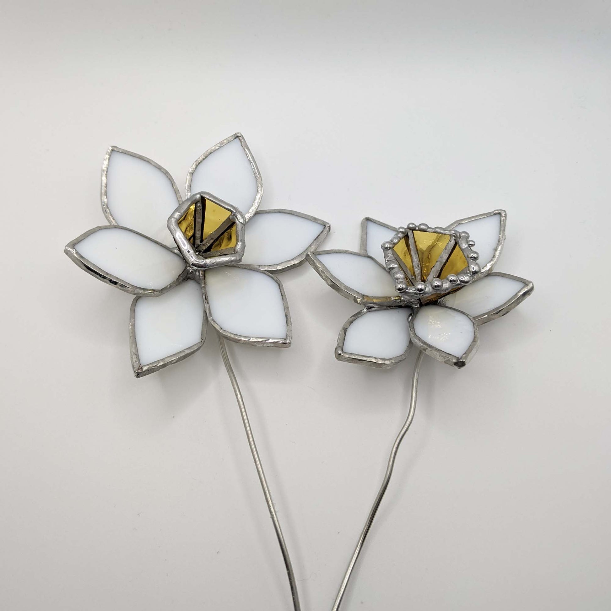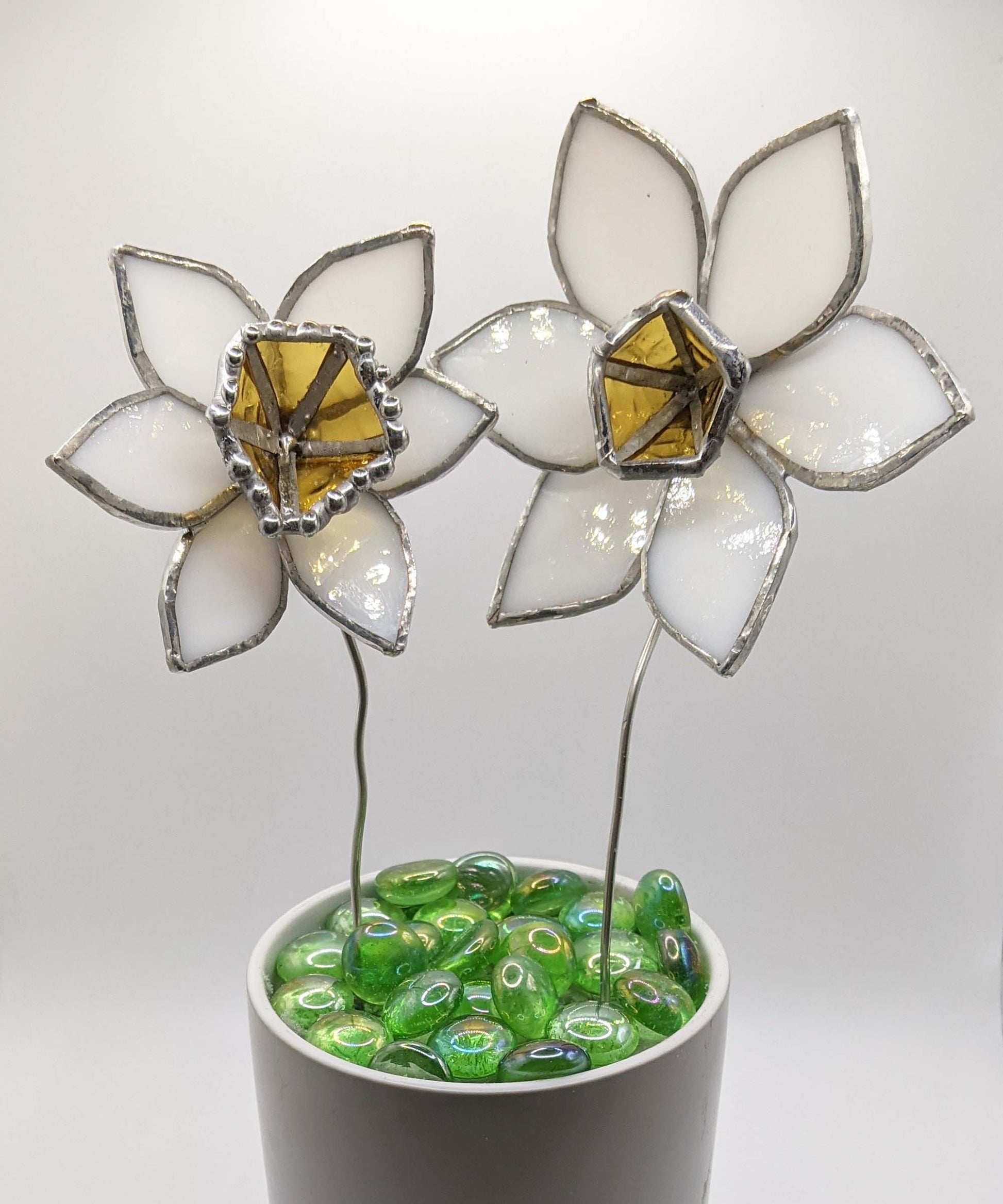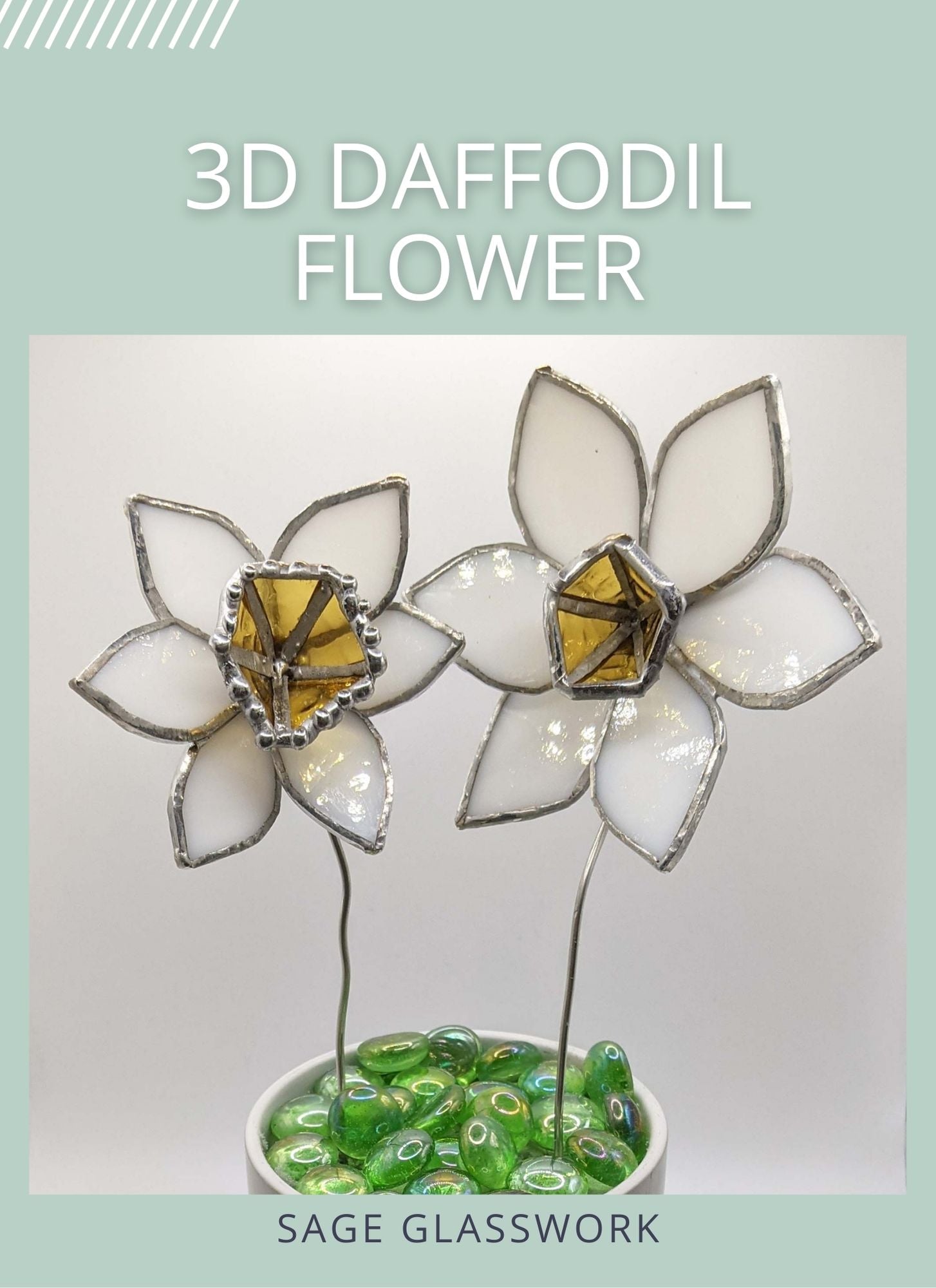 This 3D Daffodil Flower includes 3 dimensional flower petals and a stamen to make a glass flower or bouquet. This pattern, is such a lovely stained glass piece that glows in the light if made with cathedral glass! A forever plant for any home or gardener.
