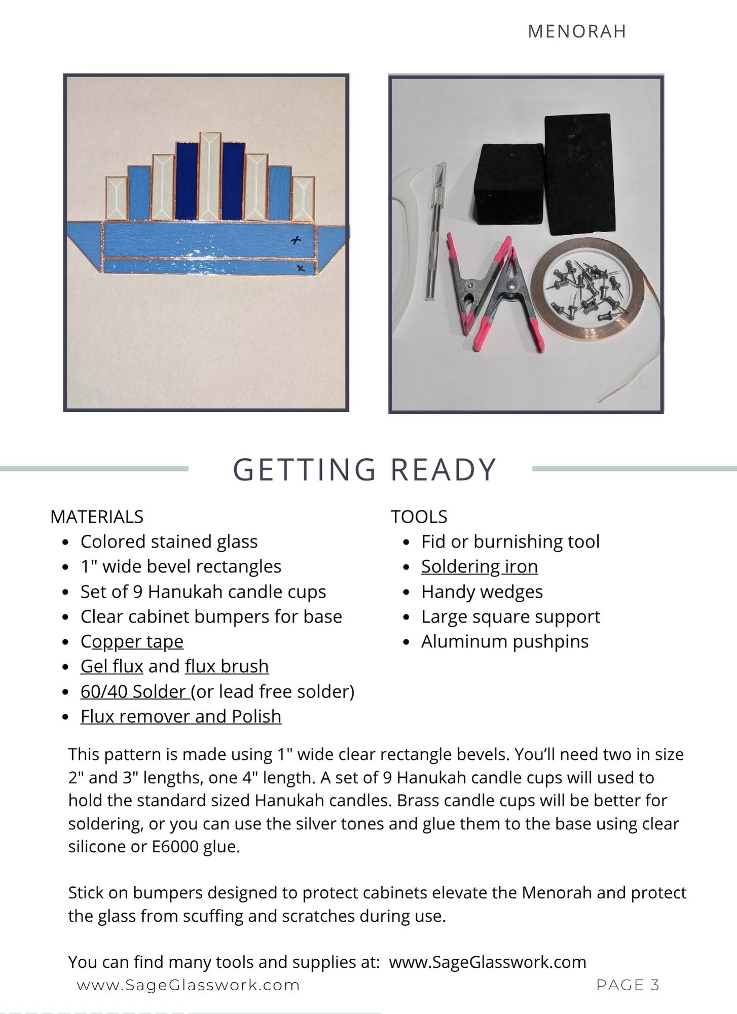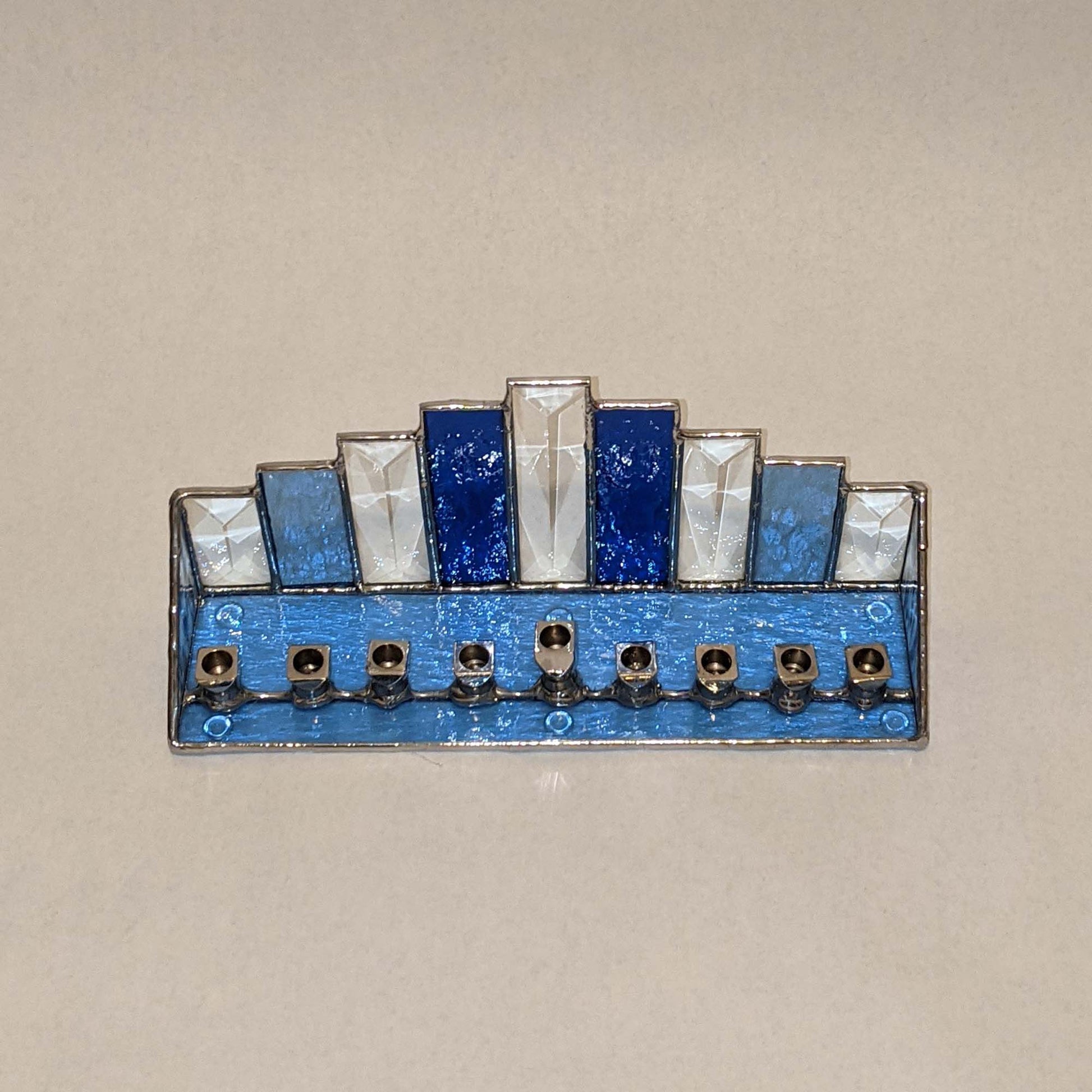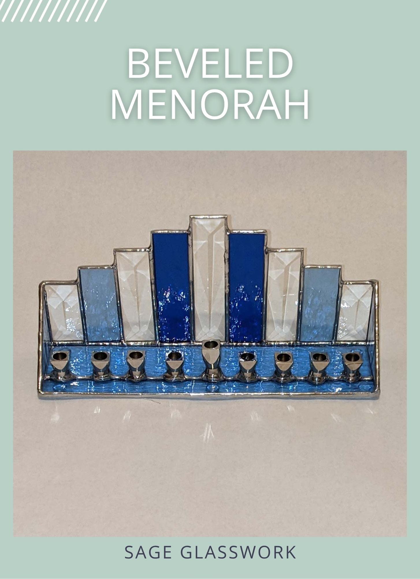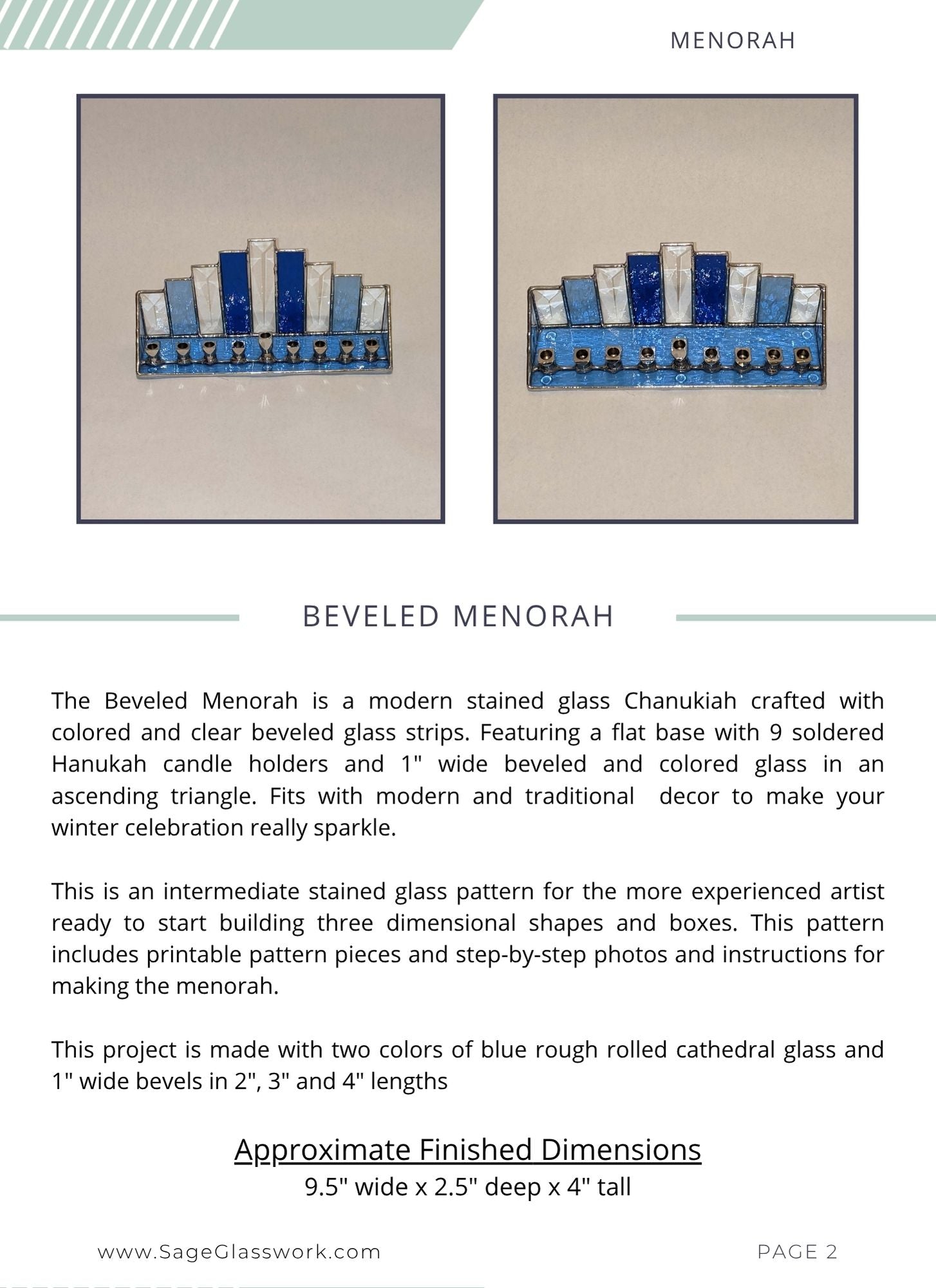 The Beveled Menorah is a 3 dimensional pattern for a stained glass Hanukah Menorah with 9 candle cups and graduated sizes of stained glass and clear beveled glass strips, for a modern menorah that will add even more sparkle to the holiday season.